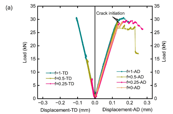 在初始加载阶段,试样表现出稳定的变形,具有线弹性行为,并且在不同加载比下刚度一致。随着载荷增加,在裂纹萌生之前,曲线出现轻微的非线性,表明轻微的基体或界面损伤开始发生。裂纹萌生后,观察到突然但轻微的载荷下降,通常伴随着可闻的裂纹形成迹象。然而,试样承受的总载荷持续增加,直到随后的裂纹扩展引发另一次载荷下降。增加加载比(f)导致裂纹萌生载荷和峰值载荷略有增加,表明横向应力部分增强了承载能力。