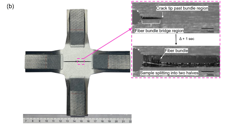 在裂纹扩展过程中,可以清楚地观察到纤维桥联,它在延迟裂纹增长方面起着至关重要的作用。在裂纹萌生时,裂纹尖端延伸到纤维束区域,其中完好的纤维有效地桥接了裂纹。这些桥联纤维重新分布了应力,减缓了裂纹增长,并使其以小增量扩展。然而,当裂纹尖端传播超出纤维束区域时,桥联效应逐渐减弱。随后,桥联纤维断裂,导致裂纹快速扩展到整个标距段并最终失效。